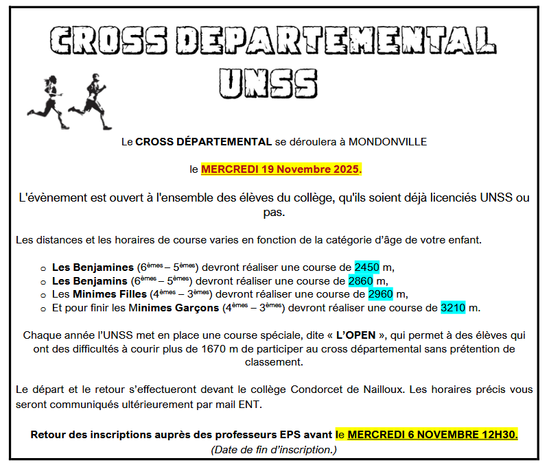 Le cross départemental UNSS aura lieu mercredi 19 novembre à Mondoville. Il est ouvert à tous, licencié ou non. Pour participer, inscriptions auprès des professeurs d'EPS jusqu'au Mercredi 5 novembre.